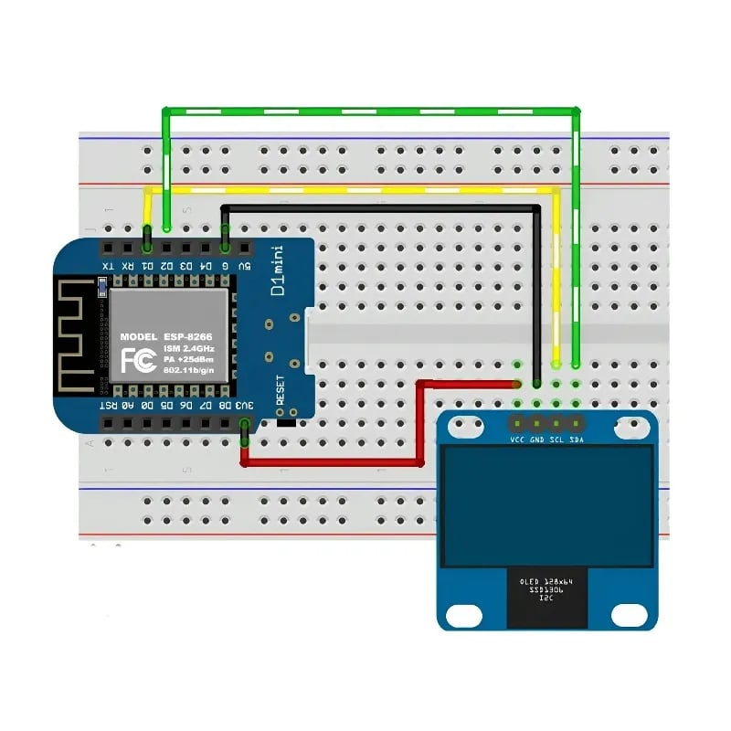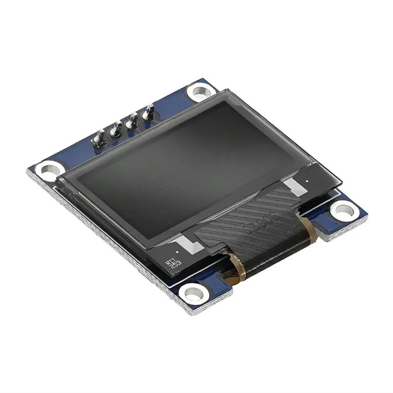 OLED displayen är mycket liten, med 3 cm skärmdiagonal och lätt att läsa av tack vare hög kontrast. 128 x 64 bildpunkter som styrs individuellt av det inbyggda SSD1306-chippet.